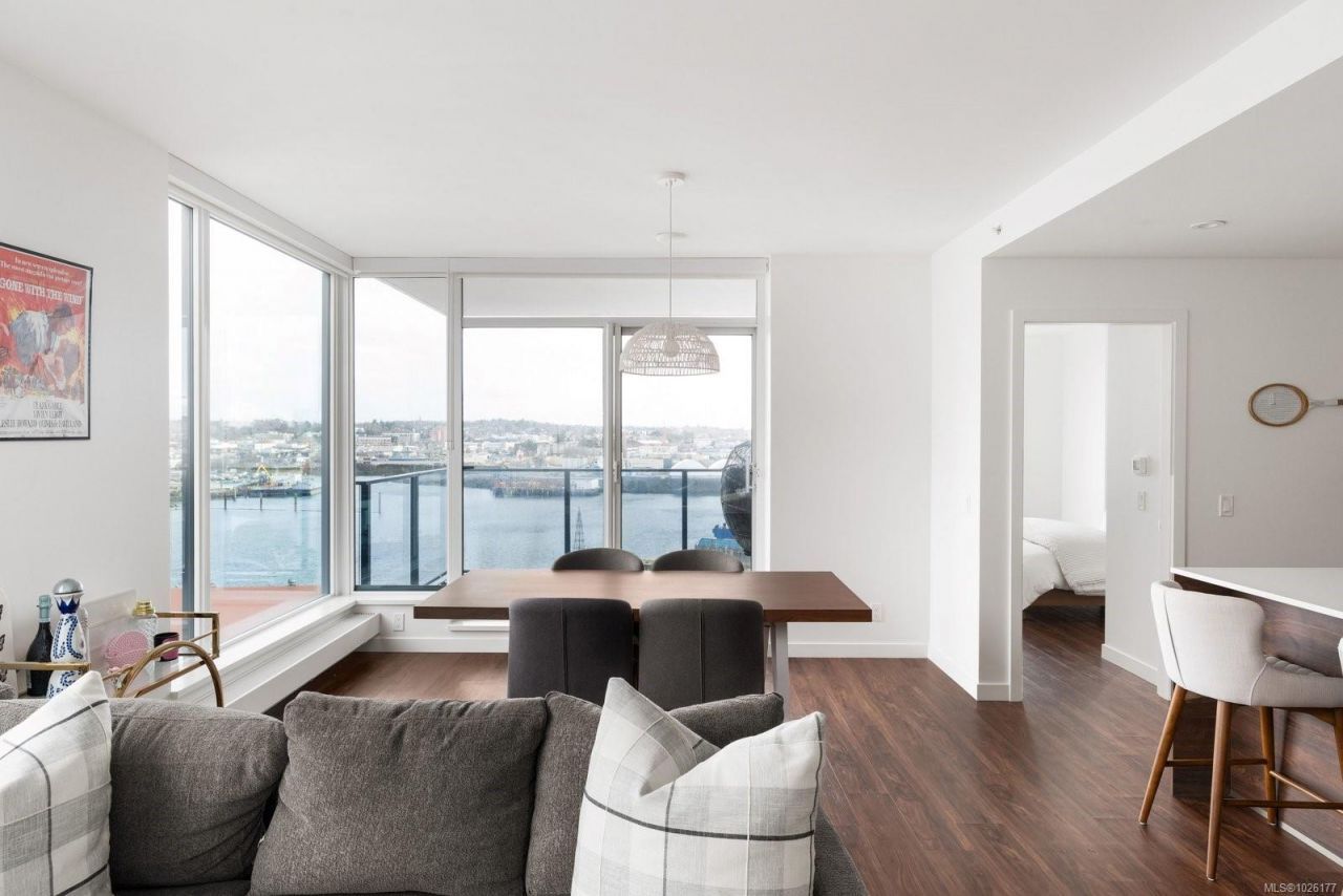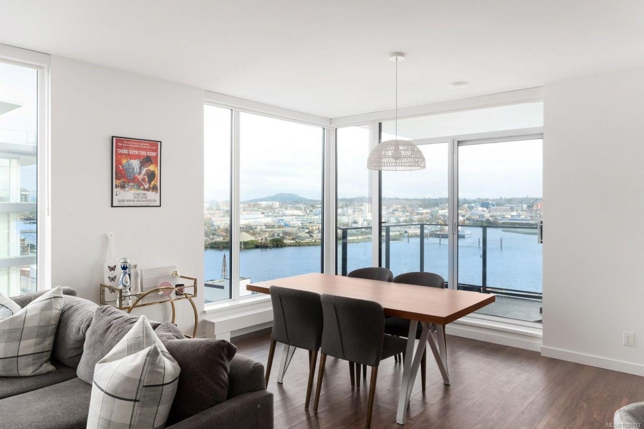 Sweeping ocean & downtown views from this corner unit on the 8th floor of 369 Tyee (Tower 1). This luxurious 2 bed/2 bath urban oasis in the heart of Vic West is thoughtfully designed with a perfect blend of modern living with sustainable features. Almost 1,100 sqft of open-concept living space, the kitchen boasts Stosa Italian cabinetry, sleek stainless steel appliances, quartz countertops, and a convenient breakfast bar. The primary bedroom is a tranquil retreat with a large ensuite & walk in closet. The 2nd bedroom is perfect for guests or office with amazing views of downtown. A large private patio overlooks the waterway, perfect spot...read more